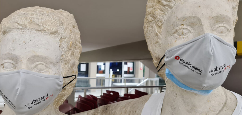Der Mund-Nasen-Schutz ist ein wirksamer Bestandteil zum Schutz vor Corona. Mit Unterstützung des Fördervereins stellt die Schule jeder Kollegin und jedem Kollegen einen Mund-Nasen-Schutz kostenfrei zur Verfügung, der von der Kollegin Nina Wagner optisch sehr ansprechend mit dem Schullogo und dem Slogan „mit abstand die nummer eins“ gestaltet wurde. Der Schulleiter Dr. Rüdiger Tauschek freut sich über die Aktion, die gerade in diesen schwierigen Zeiten ein Symbol für die Zusammengehörigkeit im Kollegium darstellt. Viele Rückmeldungen aus dem Kollegium bescheinigen der Maske einen guten Tragekomfort, der speziell an langen Unterrichtstagen wichtig für die Akzeptanz der Maßnahme ist.