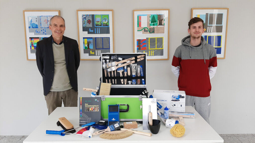Der Malerkoffer ist bestückt mit allem was das Malerherz höherschlagen lässt und für eine erfolgreiche Prüfung benötigt wird. Passend zur aktuellen Prüfungsvorbereitung konnten auch Fachbücher und Prüfungsvorbereitungshefte überreicht werden. Eine Urkunde wurde sowohl für den Azubi als auch für seinen Ausbildungsbetrieb ausgestellt.